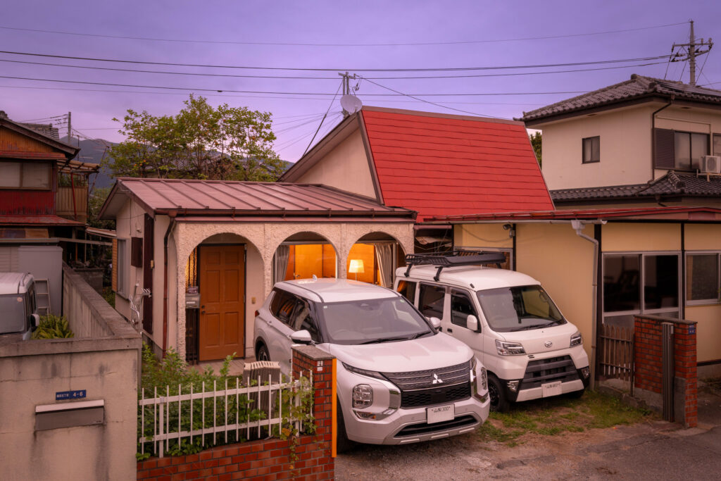今回の宿は、宿の前に普通車2台が止められる駐車場付き。もちろん他の宿と同様、1日1組限定の1棟貸の宿です。