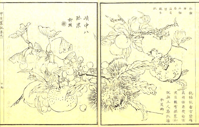 弥生時代の遺跡から発見された桃の種 南アルプス市文化財課さんによる地域の遺跡発掘から、弥生時代の集落跡から桃の種が出土しています。 それくらい昔から、この地に桃があったという事ですが、当時の桃は食用というより、薬や呪いの祭事に使われたのではないかと推測されています。 古事記や桃太郎の説話でもそのような記述がみられています。 江戸時代前期の甲斐の国で藩主を務めた柳沢吉保の統治時代(1704年〜1724年頃)、当時の甲府藩は桃の栽培を奨励したという話が伝わっています。 江戸時代でも桃は、花を楽しむ花桃としての役割が主流で、実は漬物にしたり、煮たりして食べるという使い方がされていたそうです。 とはいえ江戸時代後期、山梨の果物はすでに「甲斐八珍果(峡中八珍果)」という名前でブランド化されていました。 その名の由来となったのが、**1851年に出版された地誌『甲斐叢記(かいそうき)』**です。 著者の大森快庵は、甲州街道を通じて江戸に運ばれ珍重されていた8つの果物(ブドウ、モモ、ナシ、カキ、クリ、リンゴ、ザクロ、クルミまたはギンナン)を写生し、 この名を付けました。